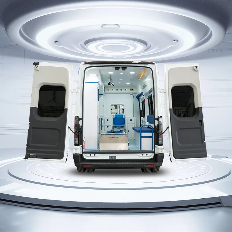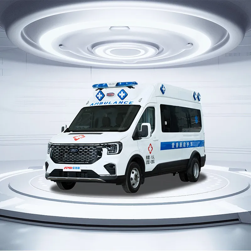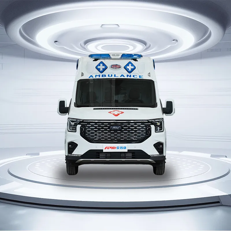 APK/Ambulance/Frod V363/LWB/LR-MR/AT-MT/Diesel. Ambulance provides advanced medical transport services for patients requiring continuous intensive care and advanced life support, the vehicle can be customized with different exterior designs, interior layouts, and medical configurations according to customer requirements.